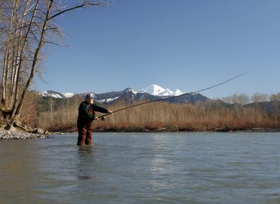 (Wayne) Rivers like the Nooksack, Skagit and North Fork of the Stillaguamish have been a few of my favorites in Washington. The Thompson River in Canada at one time was a magnificent river. These rivers were large factors in my decision to settle in this area for life. I now own 25-30 Spey rods and reels, a hundredweight of reels, and a mile or so of Spey lines -- most second hand; and I continue to buy and sell them.